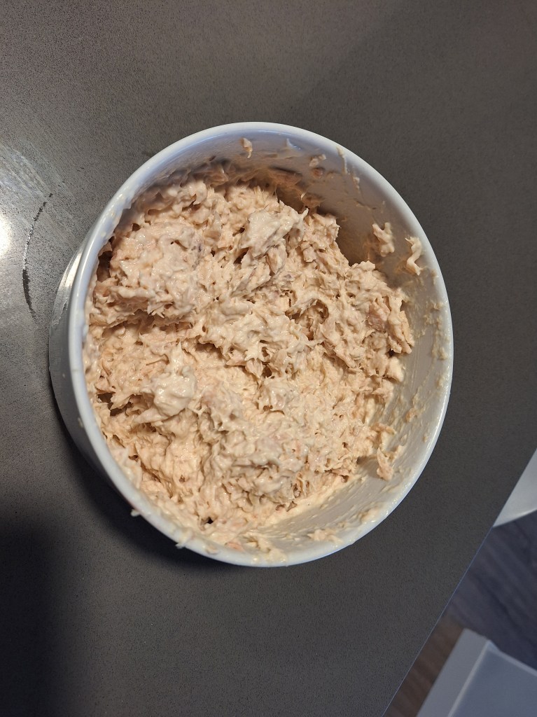 Para el relleno mezcla el atún con la cebolla bien picadita y la mayonesa. Le puedes añadir unas ramitas de perejil o cilantro. El relleno tiene que quedar bien jugoso, así que si ves que ha quedado un poco seco, le puedes añadir más mayonesa.