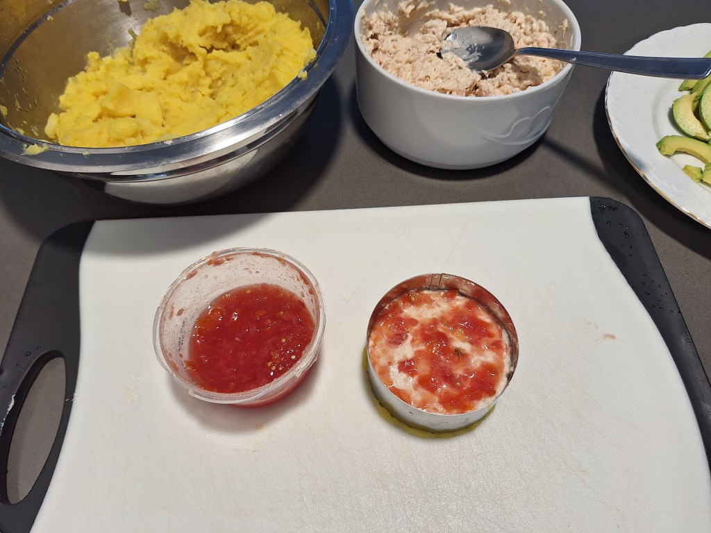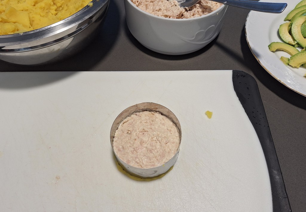 Para montar las causas yo utilicé un aro de emplatar como el que ves en la foto. Lo pinté previamente con aceite por dentro para poderlo sacar luego fácilmente. Después coloqué dentro del aro una capa de la pasta de papa de 1, 5 am de espesor más o menos.