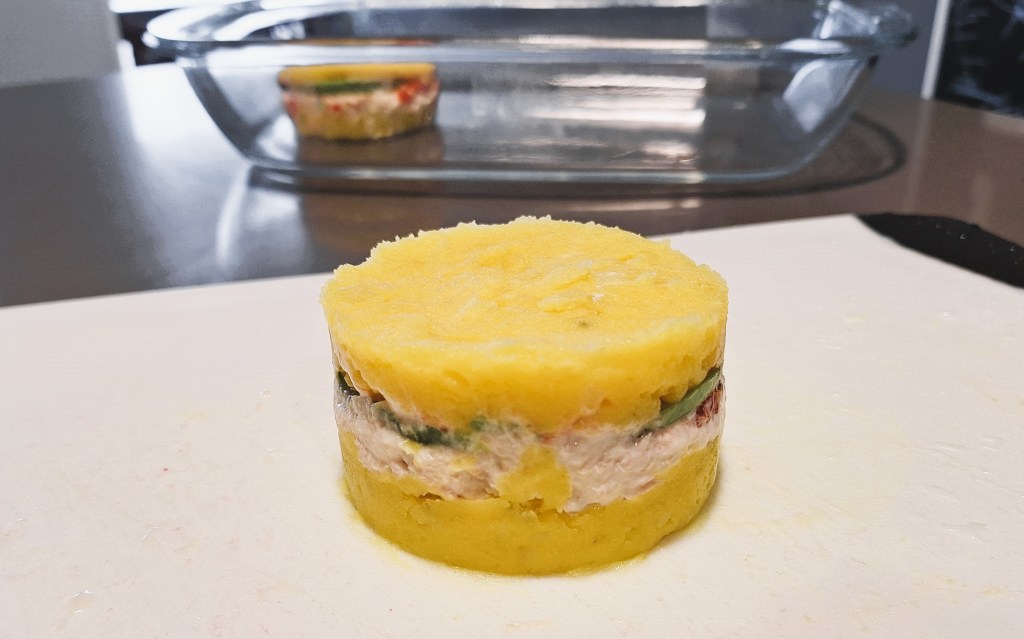 y por último otra capa de papa, retiramos el molde y ¡ya la tenemos lista!