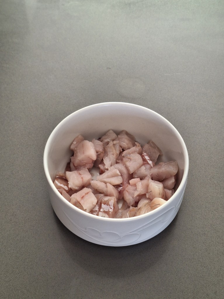 Una vez tengamos el pescado preparado en lomos y sin espinas, lo cortaremos en dados de aproximadamente 2 cm. y lo aderezaremos con sal y un poco de ají. Lo reservamos en un bol.
