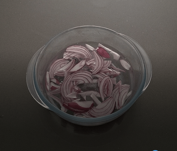 El primer paso es cortar la cebolla en pluma y ponerla en remojo en agua con sal. Así conseguiremos que el sabor no quede demasiado fuerte.